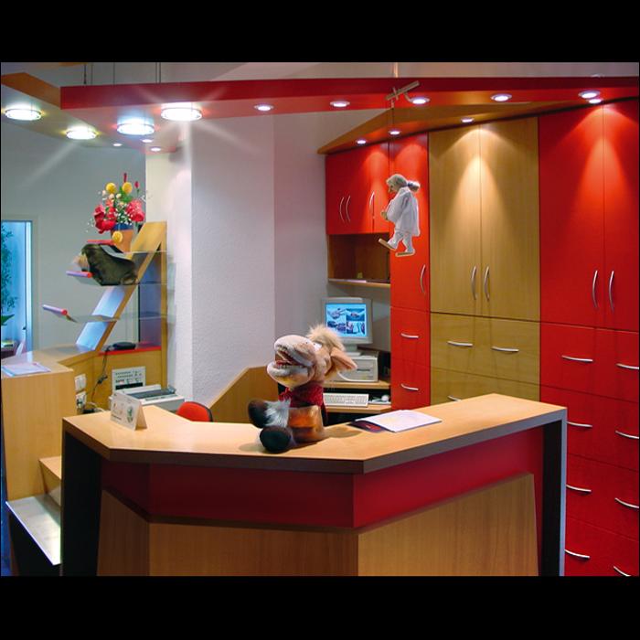 Referenzbeispiel für die Einrichtung der Kieferorthopädischen Gemeinschaftspraxis in Plauen. Neben der Funktionalität lag der gestalterische Ansatz auf einer kindgerechten Gestaltung mit warmen, kräftigen Farben und vielen pfiffigen Details, die eine Atmosphäre des Wohlbefindens erzeugen.