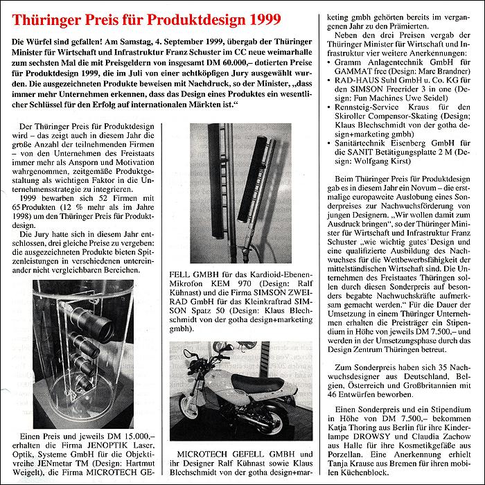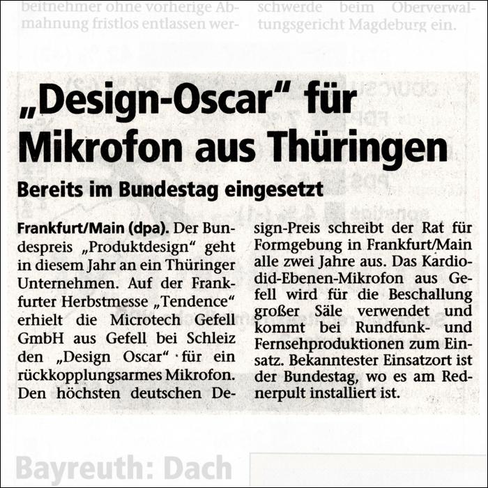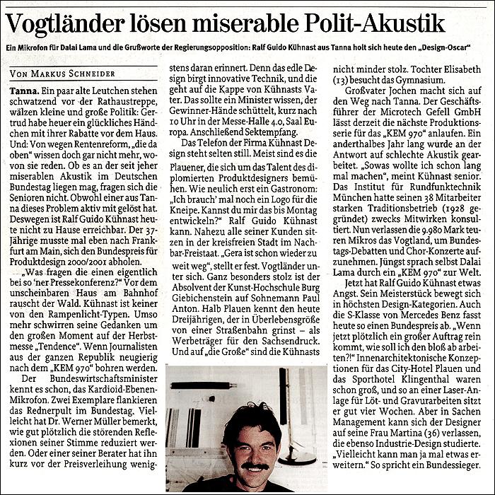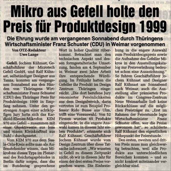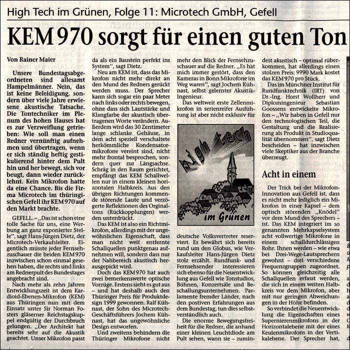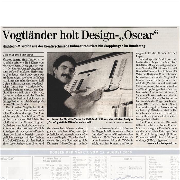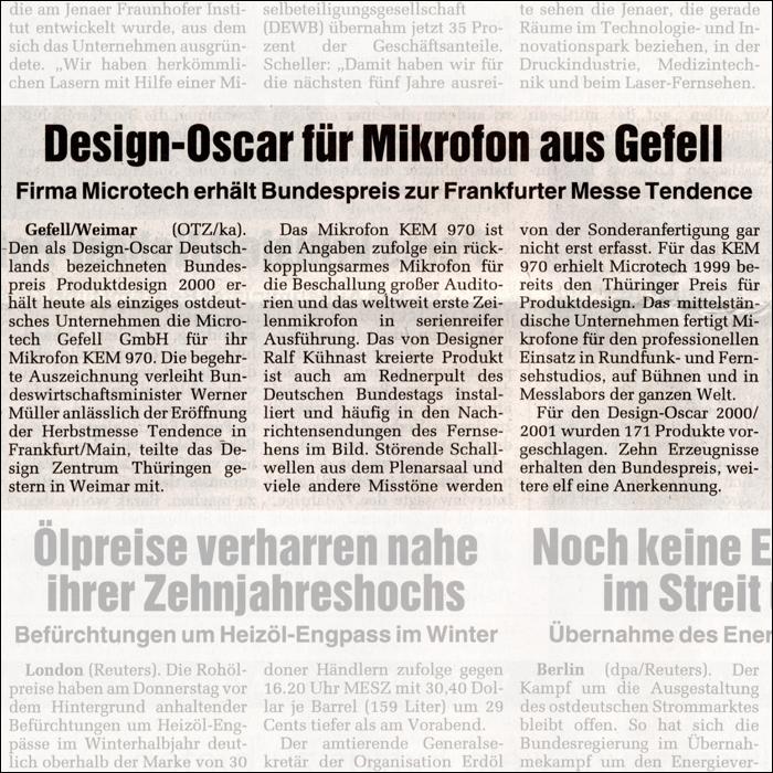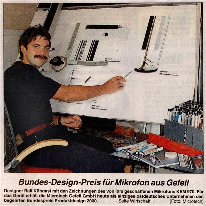 Auch in diesem Jahr konnte ein im Jahre 1999 bereits mit dem Thüringer Preis für Produktdesign ausgezeichnetes Produkt einen der begehrten Preise erlangen: das Kardioid-Ebenen-Mikrofon KEM 970 der MICROTECH GEFELL GMBH, Gefell. Die Verleihung des Bundespreises Produktdesign findet im Rahmen der internationalen Frankfurter Messe Tendence am Freitag, 25. August 2000 durch den Bundesminister für Wirtschaft und Technologie Dr. Werner Müller statt.